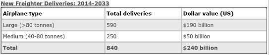 以下がボーイングの考えている航空貨物用の機体の数と売り上げの見込みです。