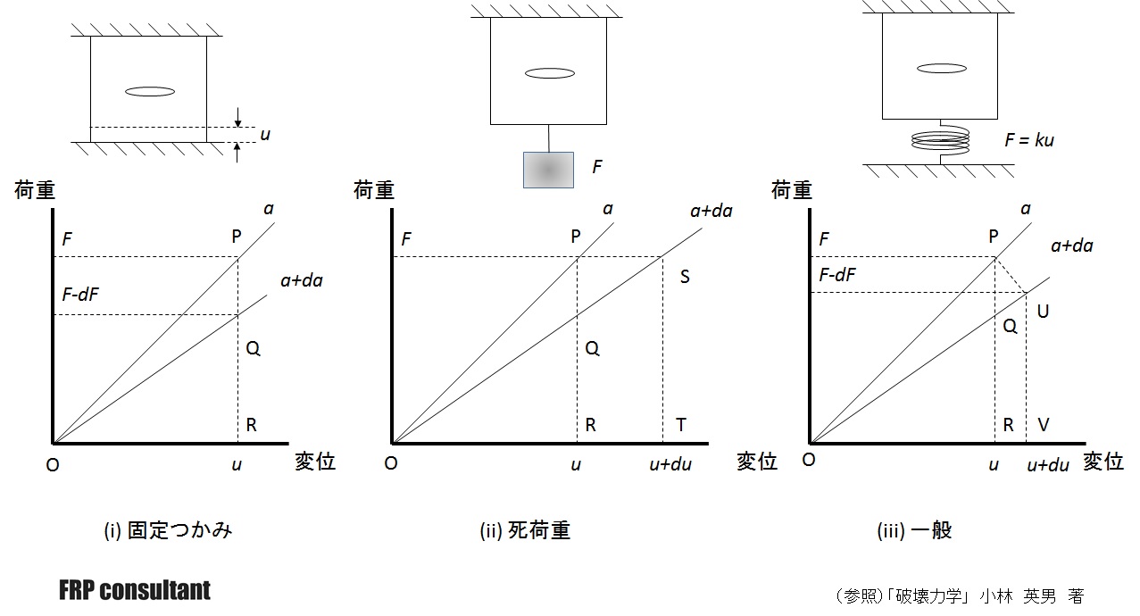 同(ii)の場合、一定荷重Fの条件下で亀裂長さがdaだけ増加した場合、
