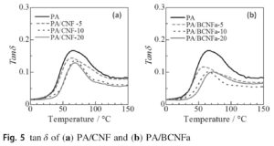 CNFやBCNFの添加量増加に伴い、 tanδ の増加が抑制されている様子がわかります。